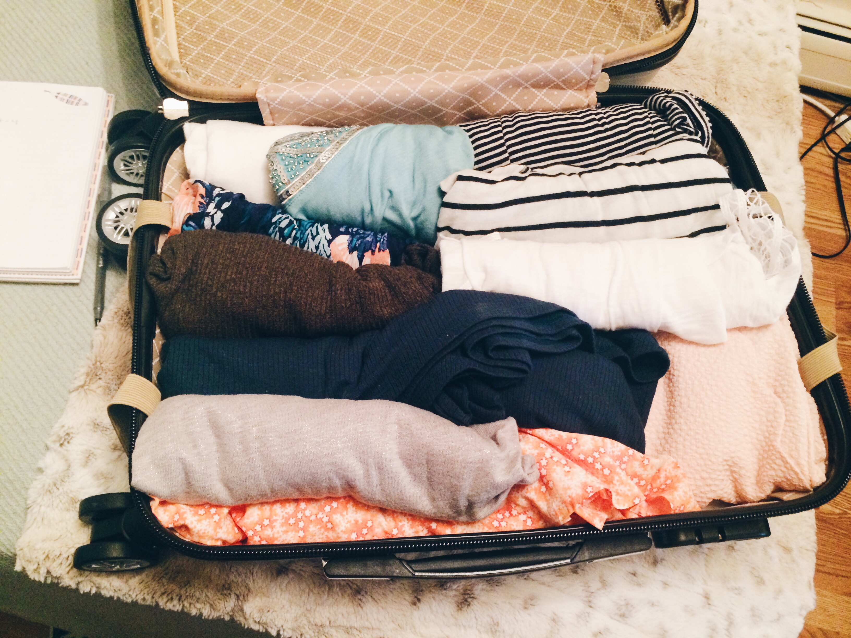 However I’m one of those types of people that needs to see how I feel in the morning rather than picking out my outfit the night before and 100% committing to it. There are so many variables that could happen throughout the night that I can’t set myself to be in specific outfit for the rest of the day, I like to have options. So for this trip I grabbed my birthday present – my first ever rolling suitcase (thanks amber!) and filled it with mix-and-match outfits.