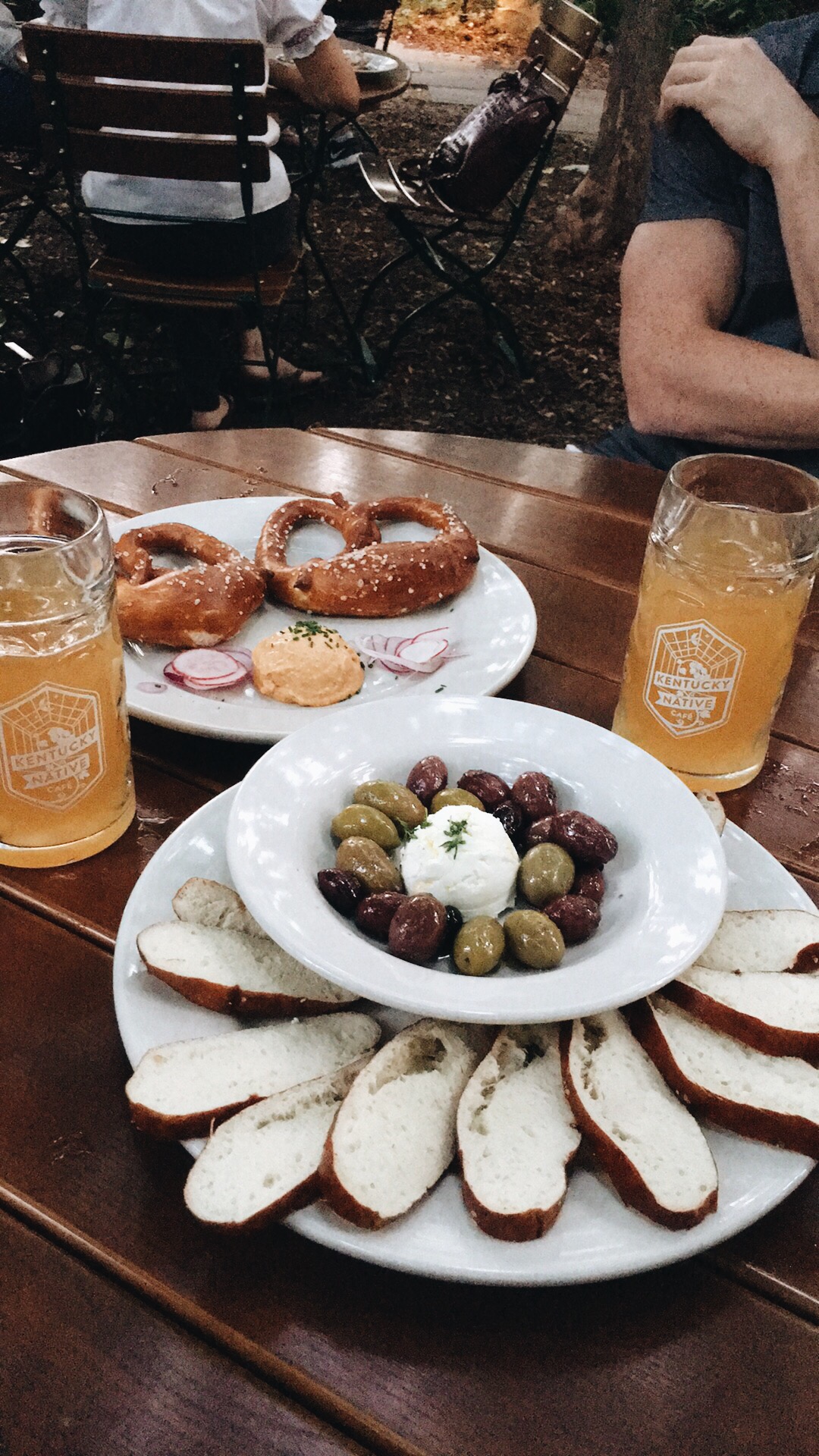 In the hotel I looked up places to eat while my mom and Matt took a nap. I Instagram “places” searched around the area. I love finding smaller local spots and seeing everyone’s artsy Insta posts about them. I stumbled upon several posts for Kentucky Native Cafe. Kentucky Native Cafe is a greenhouse turned outdoor café fully equipped with a nursery and small kitchen with tapas and beer. So cute and earthy. My mom and I absolutely loved it here. We had their goat cheese and olive plate, Bavarian pretzels with beer cheese and tried a beer/lemonade mix. Every way was amazing.