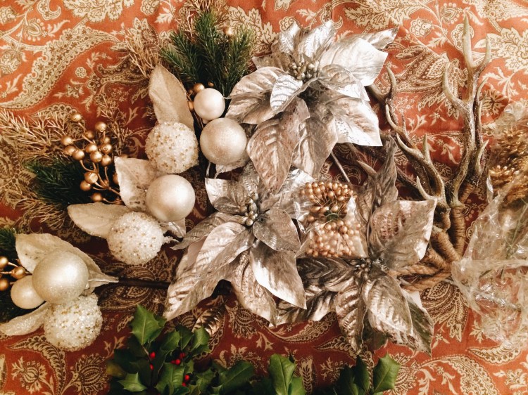 I found really pretty silver Poinsettias and ripped off the leaves to fill my wreath. With hot glue, I tacked them on in a clockwise rotation to keep a cohesiveness.
