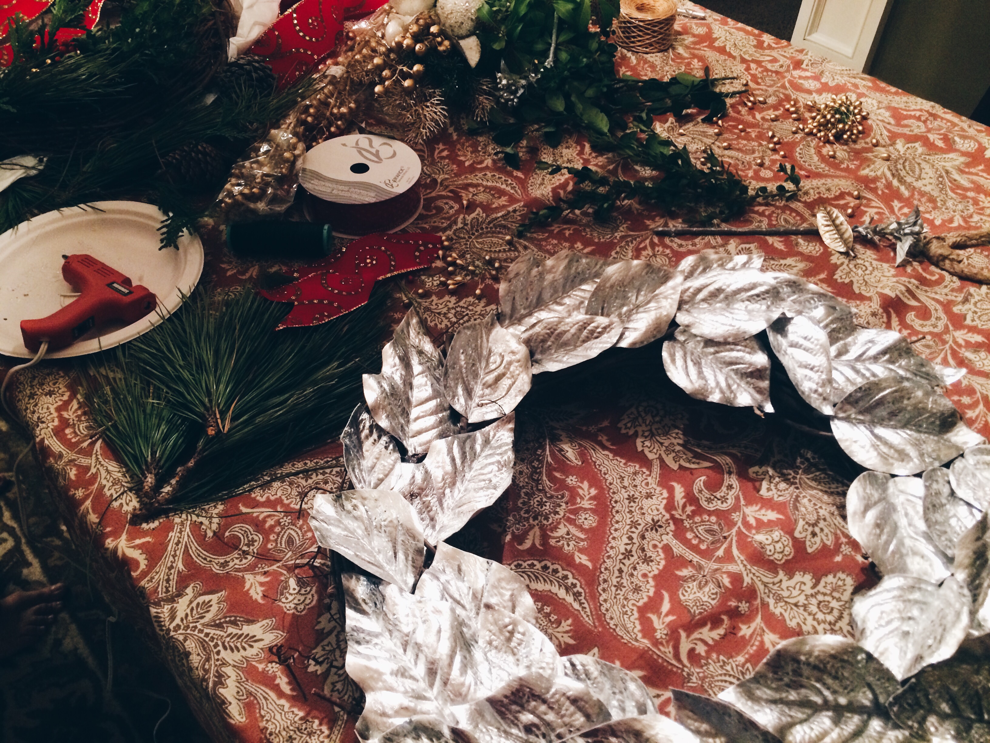I found really pretty silver Poinsettias and ripped off the leaves to fill my wreath. With hot glue, I tacked them on in a clockwise rotation to keep a cohesiveness.