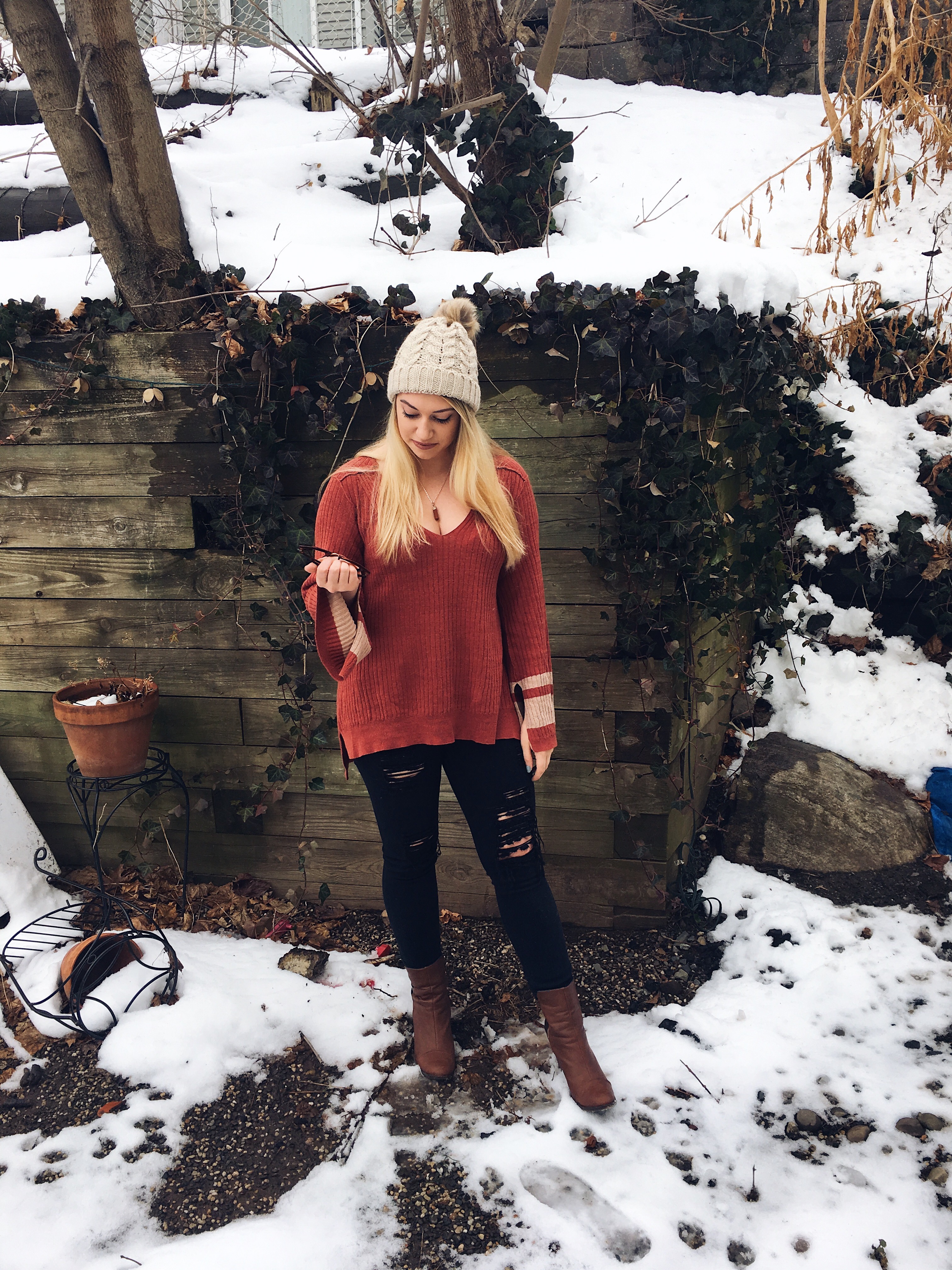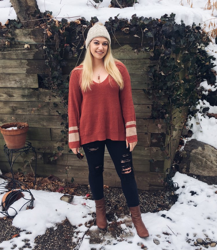 This sweater is my favorite knit yet, the material is so comfy, has an over-sized fit and this brick red hue is a nice change up from my usual neutral palette. For this look, I paired it with black denim, but this color would look great with white denim or even faux leather leggings. Add some booties or OTK boots and your’re good to go!