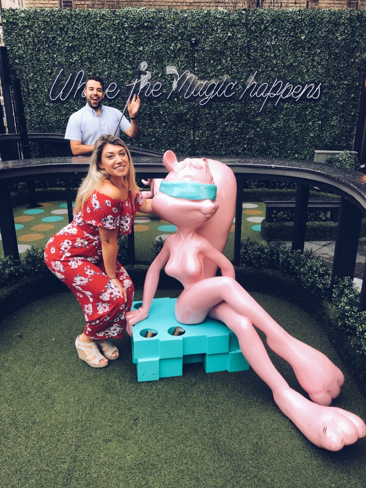 With a “theme park” atmosphere, the bar is fully equipped with putters and colorful golf balls for a few rounds of mini golf.